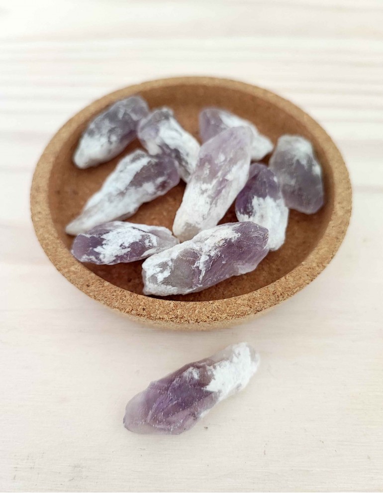 Pontas de ametista em bruto. Tonalidades podem variar.