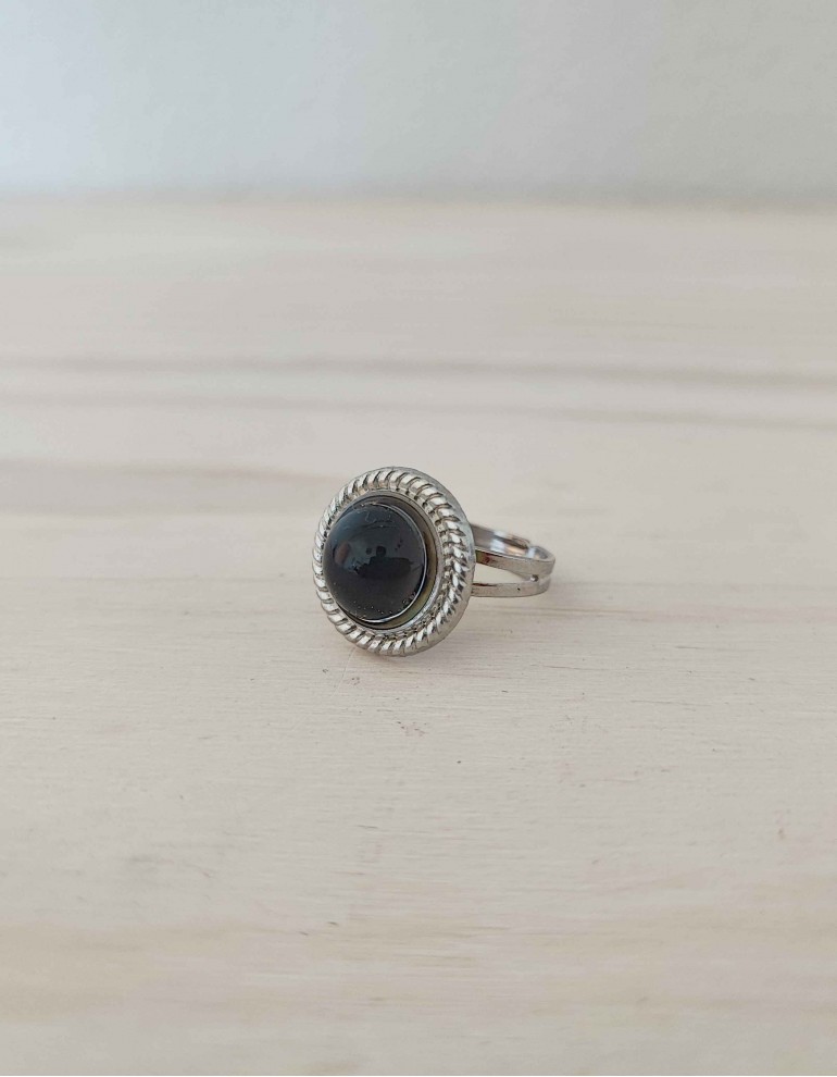 Anel em liga de zinco prateado com cabochão.