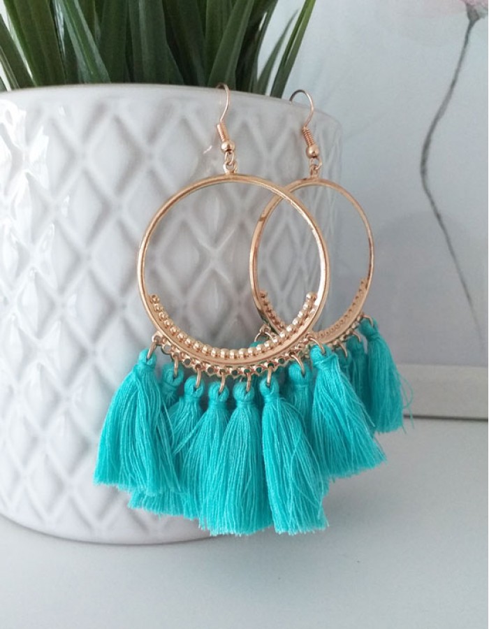 Brincos em metal com tassels azuis.