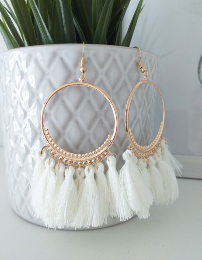 Materiais: metal liga de zinco (cor dourado), tassels de algodão (branco)