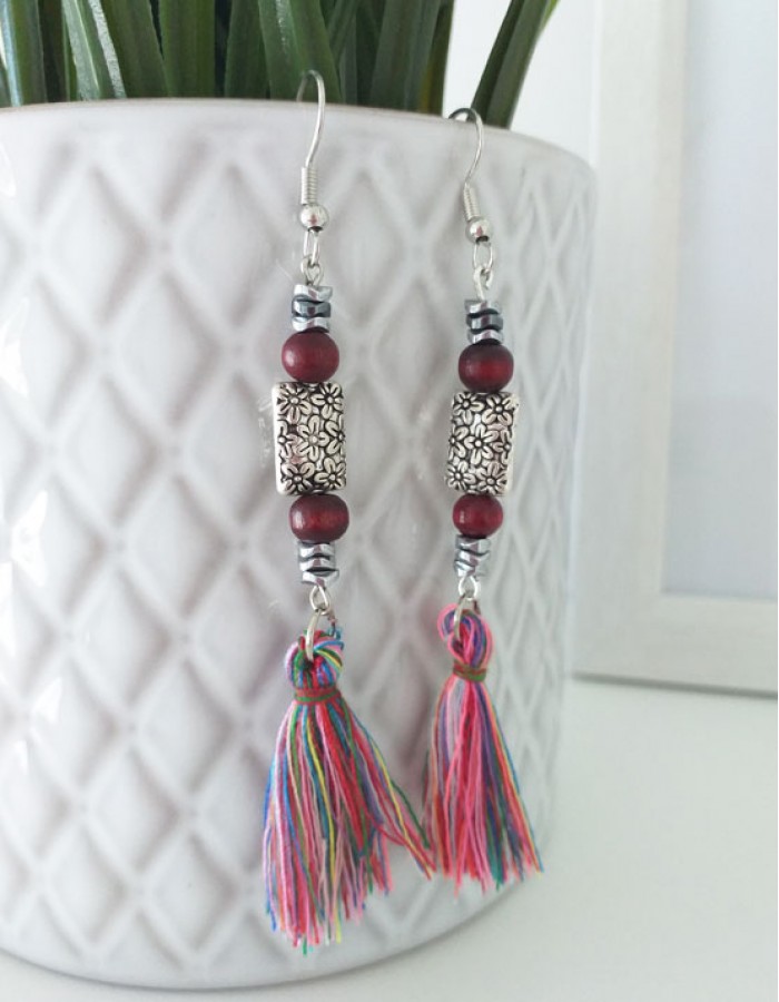 Materiais: metal liga de zinco (cor prateado), contas de madeira, tassels de algodão (coloridos)