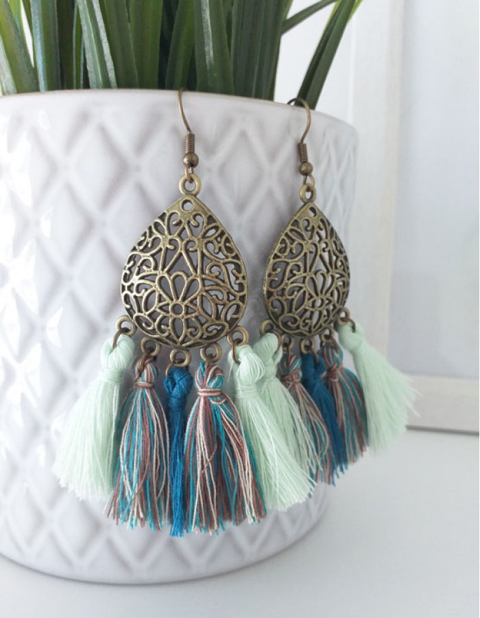 Materiais: metal liga de zinco (cor bronze), tassels de algodão (coloridos)