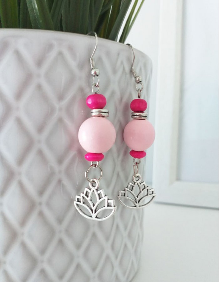 Materiais: metal liga de zinco (cor prateado), contas de madeira (cor rosa)