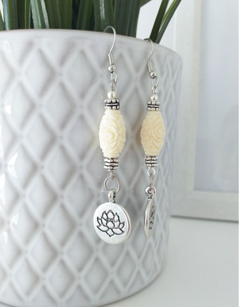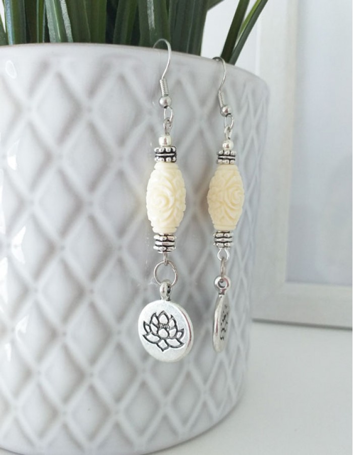 Materiais: metal liga de zinco (cor prateado), contas de acrílico (cor marfim)