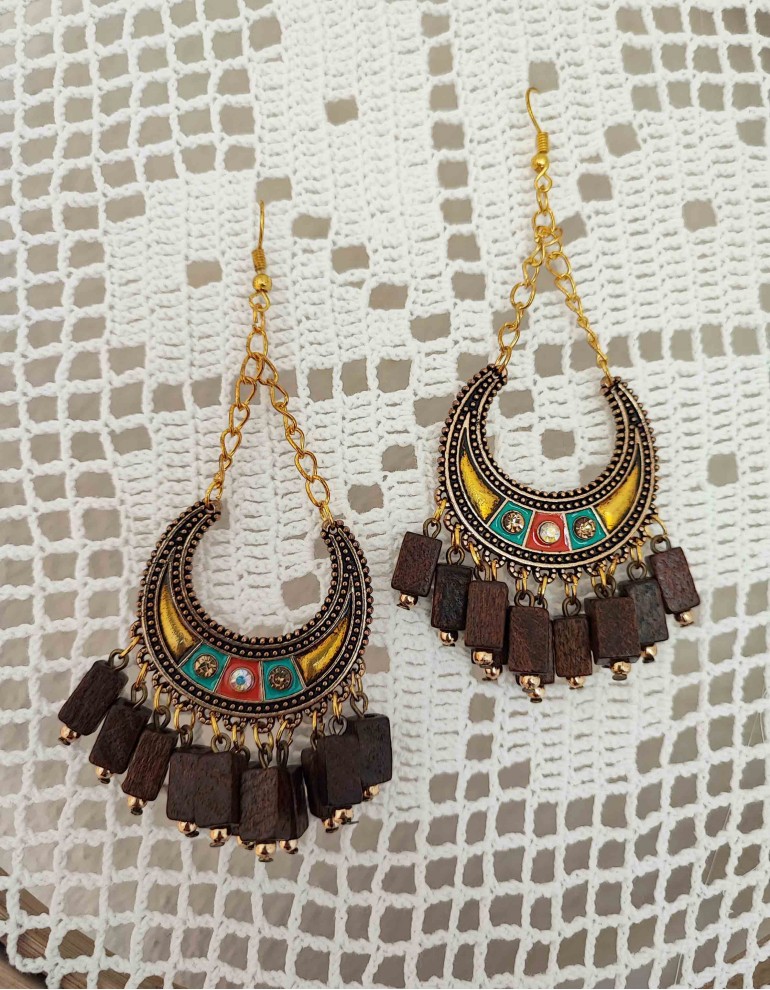 Brincos em metal com contas de madeira de nogueira e detalhes coloridos.