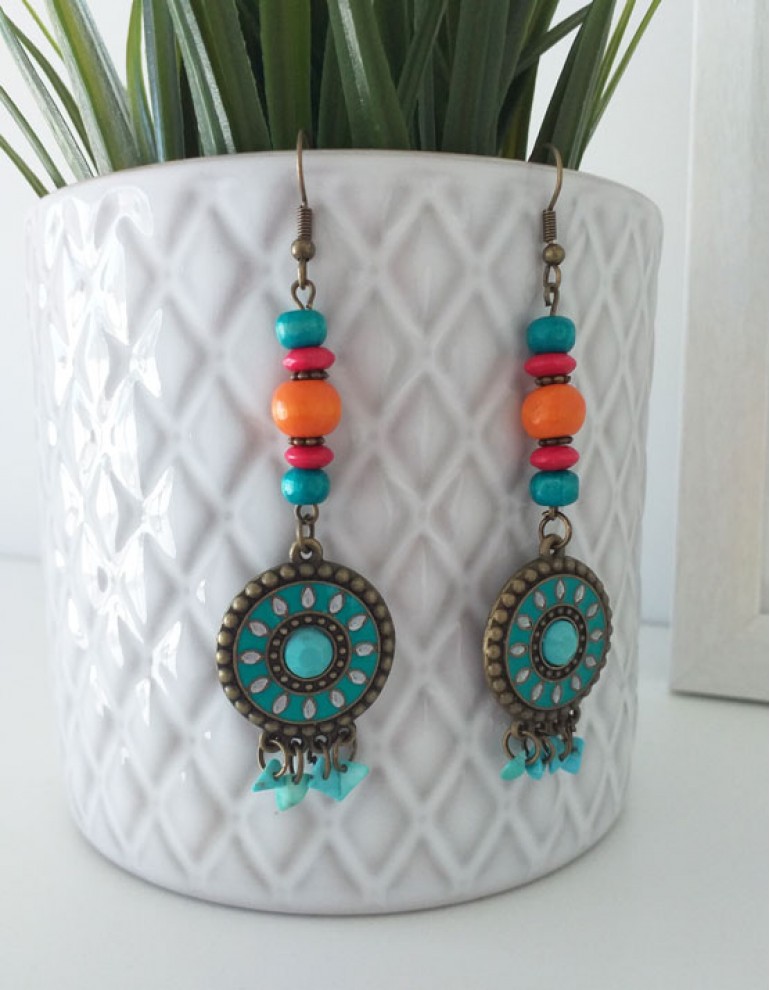 Materiais: metal liga de zinco (cor bronze), contas de madeira coloridas, turquesa natural