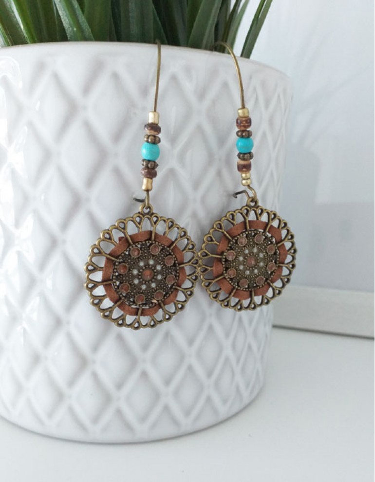 Materiais: metal liga de zinco (cor bronze), missangas de vidro e madeira
