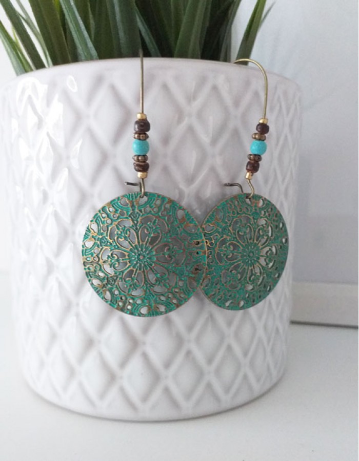 Materiais: metal liga de zinco (cor bronze com efeito pátina), contas de vidro e madeira natural