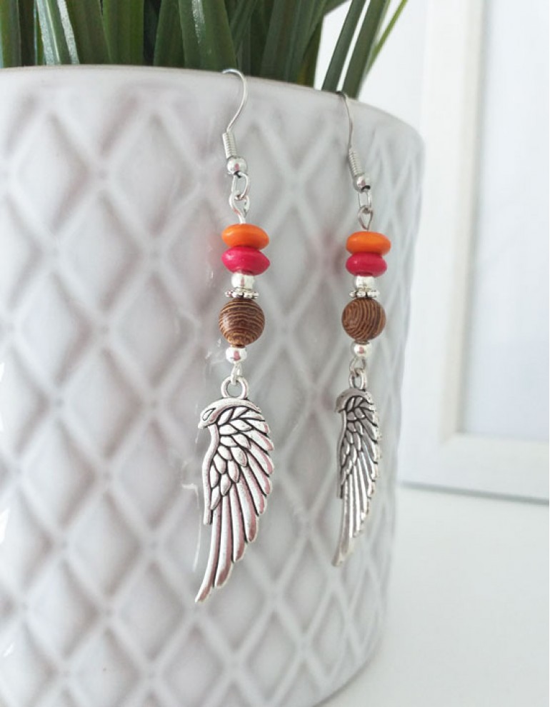 Materiais: metal liga de zinco (cor prateado), contas de madeira coloridas e wenge