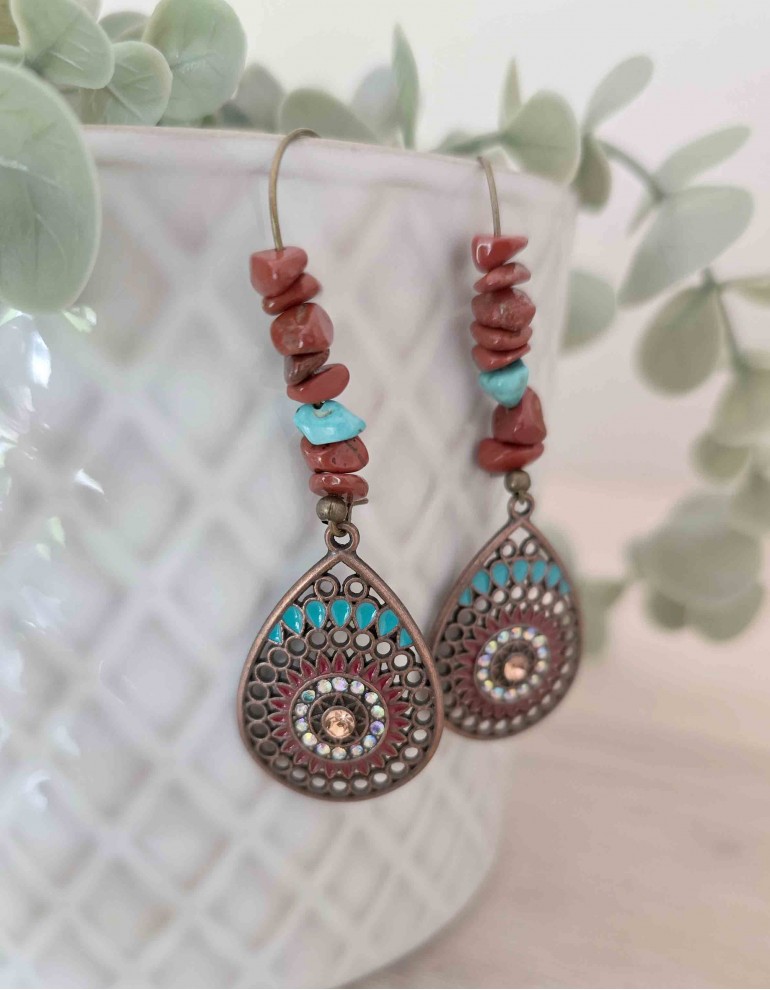 Brincos de metal em formato gota com turquesa e jaspe vermelho
