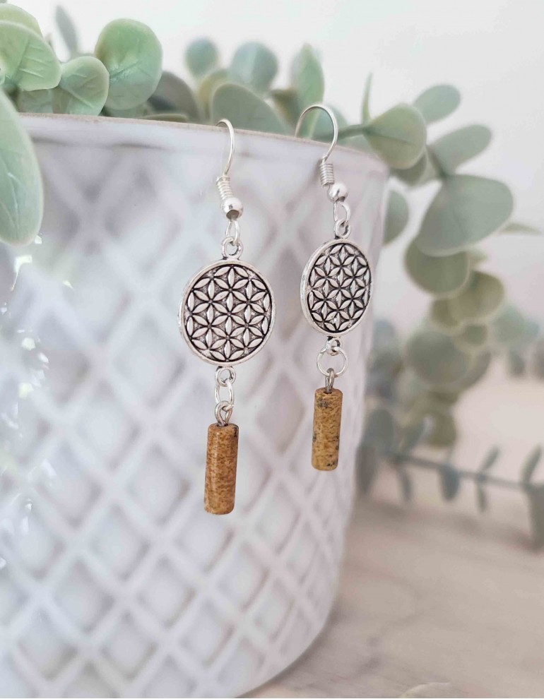 Brincos em metal com mandalas e jaspe paisagem.