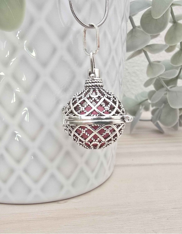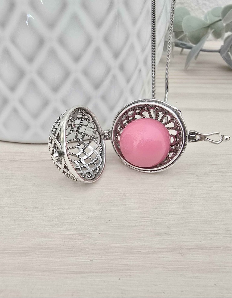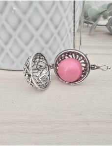 Materiais: aço prateado, esfera rosaDiâmetro aprox.: 24mmCordão: corrente prateada em aço, aprox. 70cm
