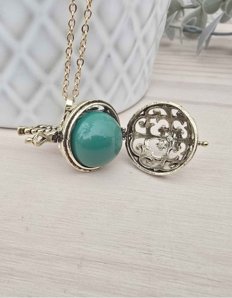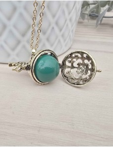 Materiais: aço dourado, esfera verdeDiâmetro aprox.: 21mmCordão: corrente dourada em aço, aprox. 50cm