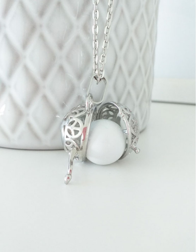 Materiais: aço prateado, esfera brancoDiâmetro aprox.: 20mmCordão: corrente prateada em aço, aprox. 60cm