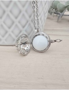 Materiais: aço prateado, esfera brancaDiâmetro aprox.: 20mmCordão: corrente prateada em aço, aprox. 70cm