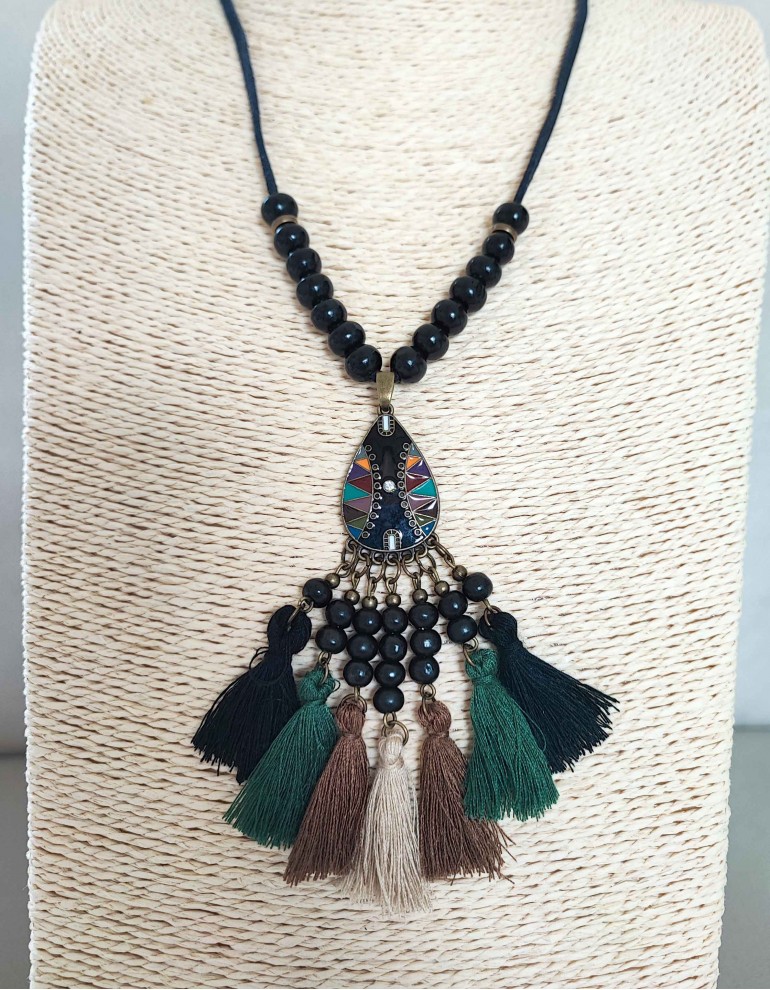 Materiais: cordão de couro preto, acessórios de metal de cor bronze com detalhes coloridos, contas de madeira, tassels de algodão