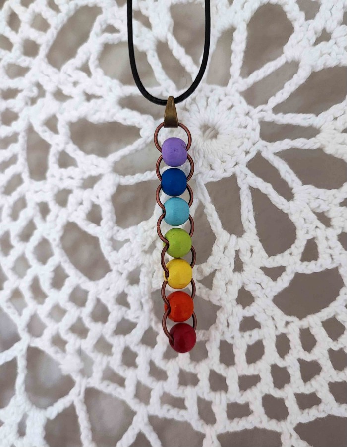 Colar curto com 7 chakras em madeira.