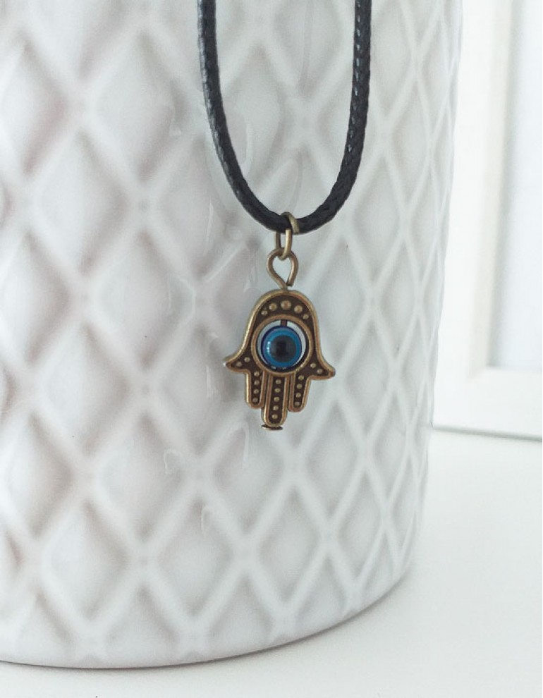 Pendente: hamsá em metal (cor bronze) com Olho Turco em vidro (cor azul)