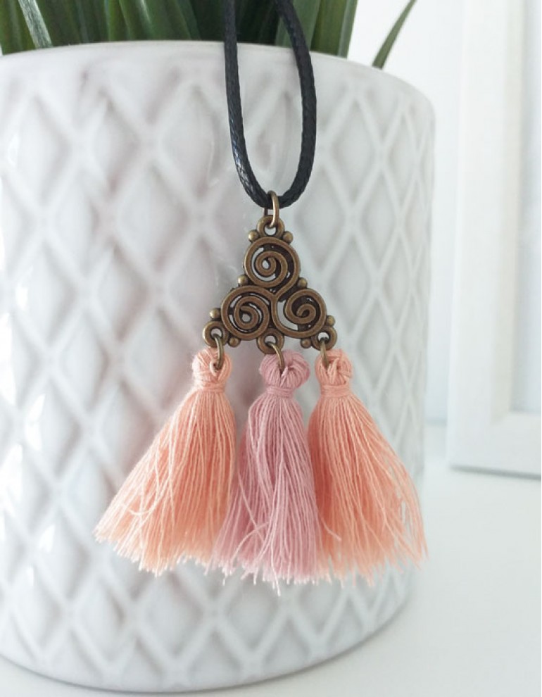 Pendente: triskelion em metal (cor bronze) com 3 tassels (cores aleatórias)