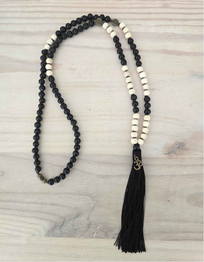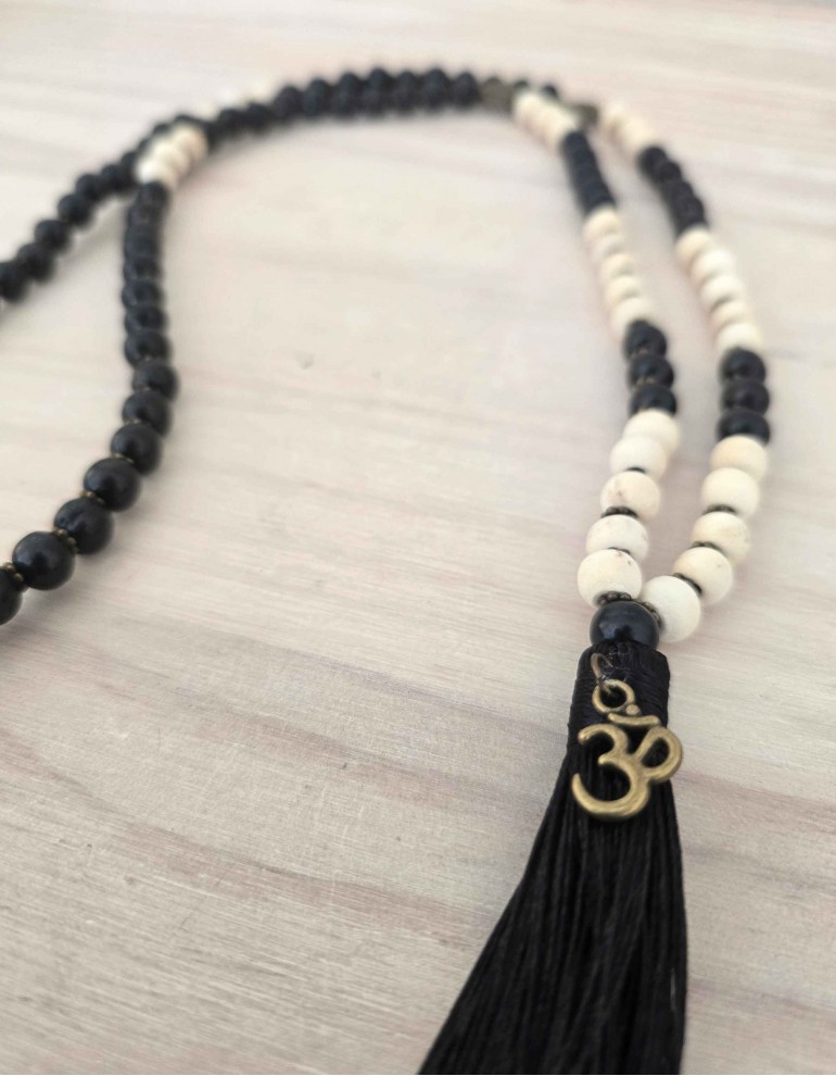 Japamala de tulsi e ébano com pendente (OM), Meru e tassel.