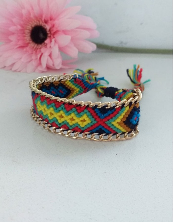 Pulseira em linha de algodão entrançada com corrente em metal.