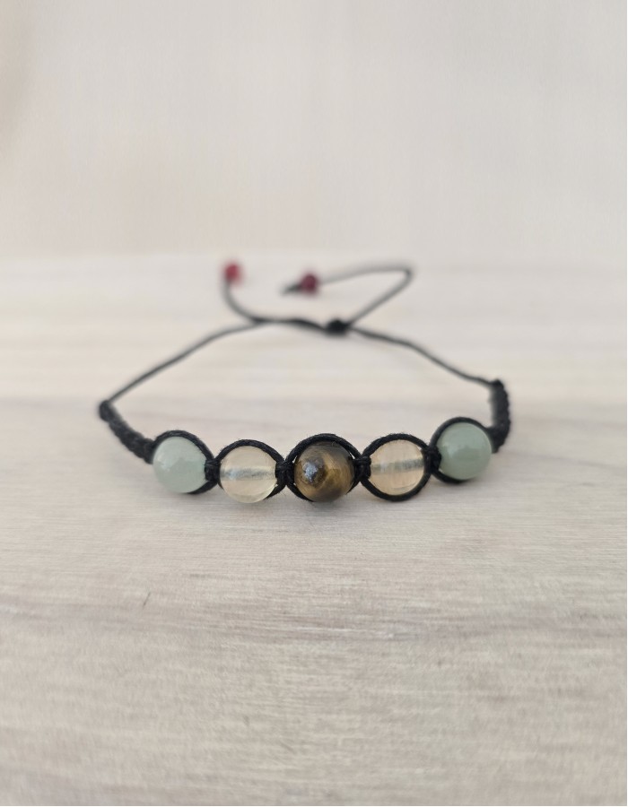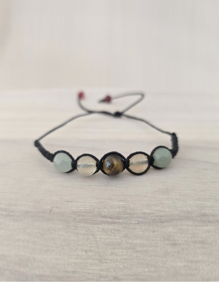 Energia: Abundância e ProsperidadeTamanho: ajustávelMateriais: cordão de algodão, citrino natural, aventurina verde natural, olho de tigre natural