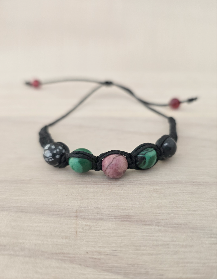Energia: Lidar com o Divórcio e com a RuturaTamanho: ajustávelMateriais: cordão de algodão, obsidiana floco de neve natural, malaquita natural, rodonita natural