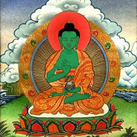 Amitabha - Segundo o Sutra da Contemplação do Buda da Vida Infinita, Amitabha ou Amida é um Buda celestial e foi um Bodhisattva numa vida anterior chamado Dharmakara, que significa "Luz Infinita". Amitabha é o Buda principal do Budismo Terra Pura, uma ramificação do Budismo praticado no leste asiático. É um dos 5 Budas transcendentais que são os guardiães da sabedoria espiritual, são emanações do Buda Maha-Vairocana, o Buda Grande Sol. Representado como um Buda a meditar, Amitabha trabalha para a iluminação de todos os seres, para a mente pura e para o despertar espiritual Surge em muitas representações acompanhado de seus discípulos, os Bodhisattvas Vajrapani (à sua esquerda) e Avalokiteshvara (à sua direita). O seu mantra é "om amitabha hrih" (sânscrito); "namu amida butsu" (japonês).
